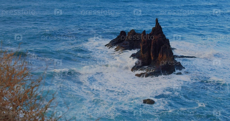 Большие волны разбиваются о черные вулканические скалы на отдаленном берегу острова Тенерифе. Кинематографический кадр глубокой синей океанской волны, яростно плещущейся по скалистому побережью экзотического острова