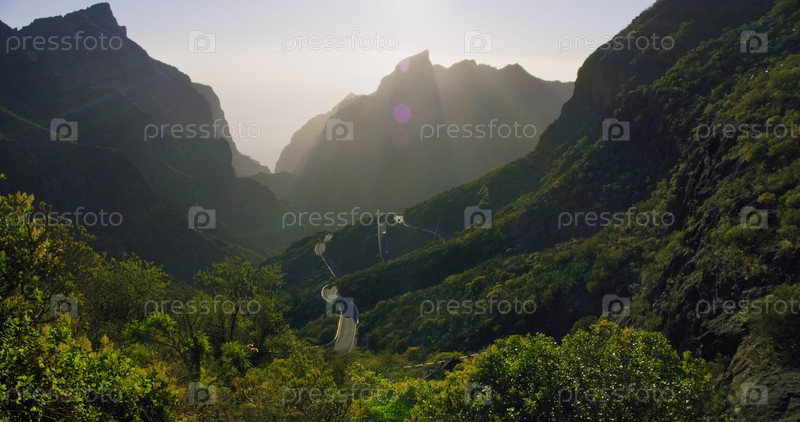 Красивый закат в долине Маска и ущелье, Тенерифе, Канарские острова, Испания. Солнечный свет пробивается сквозь горные хребты. Восхитительный вид