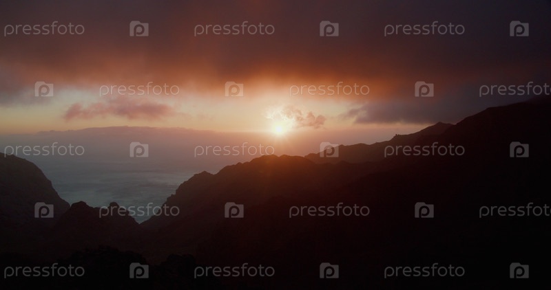 Пейзаж с горами и морем во время заката на Тенерифе, Тено, Канарские острова, Испания. Высококачественная съемка в формате 4К