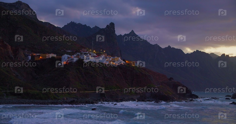 Путешествие по направлению Тенерифе на север, пляж Альмасига и деревню ночью. Маленькие огни города на холме у Атлантического океана. Канарские острова, Испания