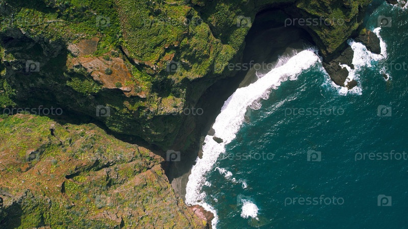 Воздушный полет над зелеными горами Анага возле деревни Чинамада. Поход на Тенерифе, Канарские острова. Береговая линия океана. Плайя де лос Трочес