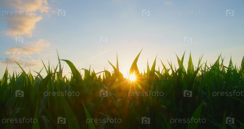 Мерцающие солнечные лучи за стеблями кукурузного поля, крупный план растений кукурузы с солнечной подсветкой. Лучи заходящего солнца пробиваются сквозь листву. Зеленые молодые початки кукурузы на фоне закатного неба