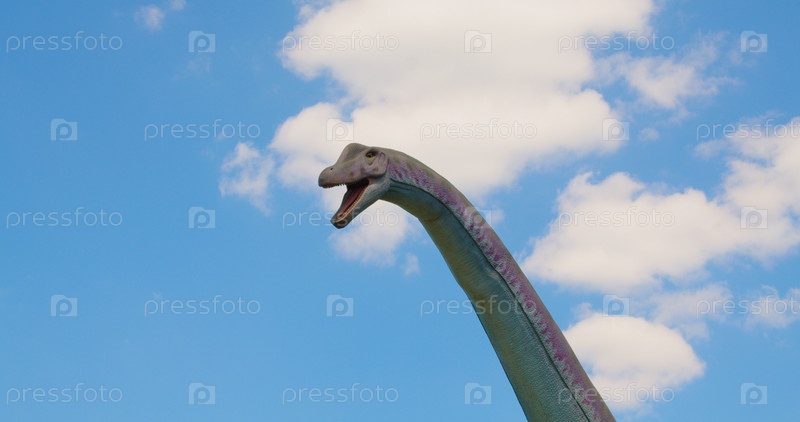 Место аттракциона парка. Голова динозавра в движении. Фигура монстра каменного века крупным планом на фоне голубого неба. Отпуск, праздничный досуг