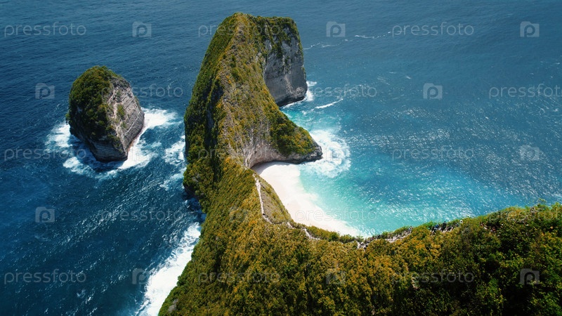Пляж Келингкинг на острове Нуса Пенида, Бали, Индонезия. Вид с воздуха на зеленый тропический мыс и океанский пейзаж