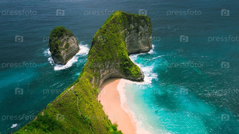 Вид с воздуха на пляж Келингкинг на острове Нуса Пенида, Бали. Знаменитая природная достопримечательность. Бирюзовая океанская вода у зеленых известняковых скал. Туристическая достопримечательность во время летних каникул