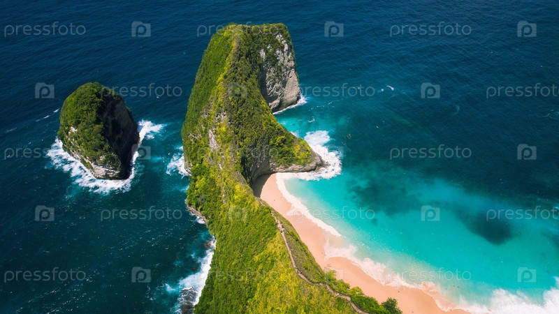 Вид с воздуха на пляж Келингкинг на острове Нуса Пенида, Бали. Знаменитая природная достопримечательность. Бирюзовая океанская вода у зеленых известняковых скал. Туристическая достопримечательность во время летних каникул