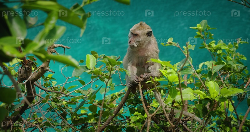 Обезьяна на берегу океана на пляже Келингкинг на островах Нуса Пенида. Жизнь диких животных в тропическом лесу. Вид на море сверху вниз с высокой скалы