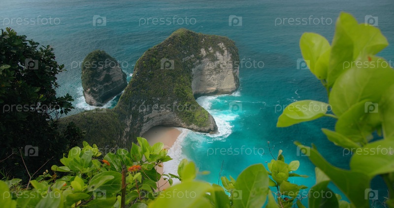 Тропический лес на побережье океана Бали-Келингкинг-Бич, Индонезия. Лазурные морские волны пенятся на чистейшем песчаном берегу. Кинематографический вид сверху вниз крупным планом
