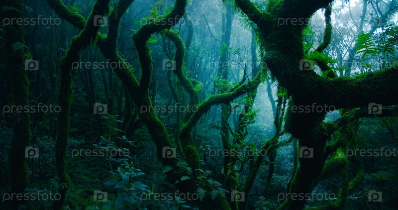 Мистический лавровый лес с пешеходной тропой в пасмурную туманную погоду на острове Тенерифе. Темный лесной массив. Сельский парк Анага. Фон природы джунглей. Старый густой лес. Пейзаж Канарских островов Тенерифе