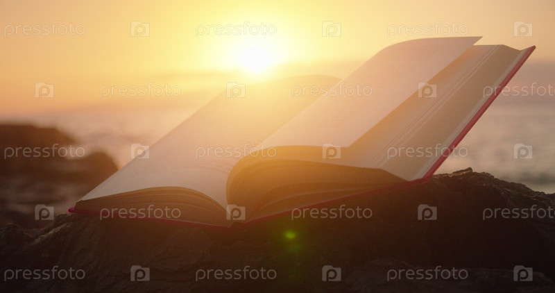 Зачарованная волшебная открытая книга на скалистом пляже при свете заката. Сказка на страницах книги