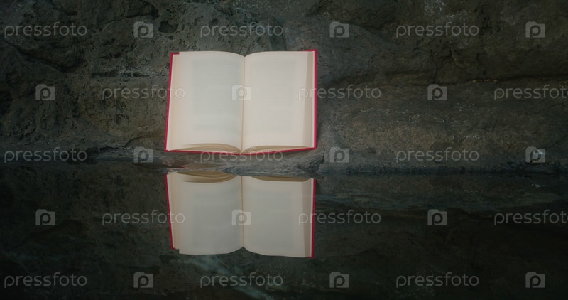 Кристаллическое отражение открытой книги в воде. Концепция мудрости знаний. Скалистый природный фон. Черные камни