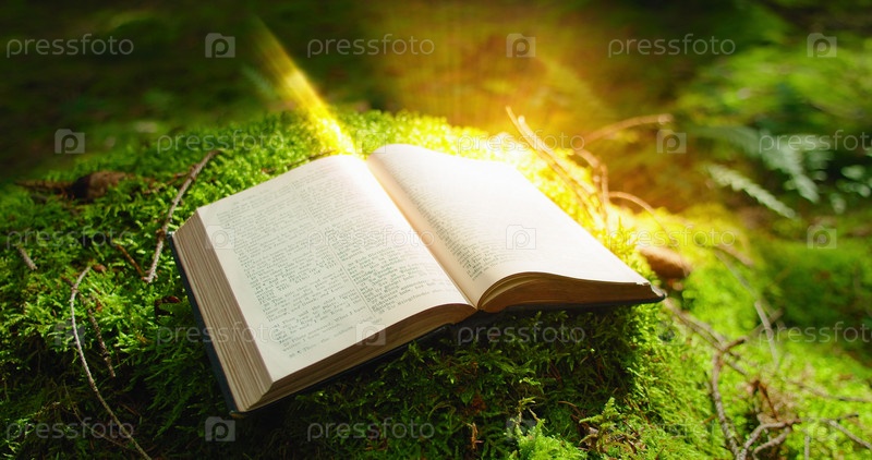 Открытая книга со световой вспышкой. Загадочная печатная книга с волшебной историей. Ученье свет а неученье тьма. Иллюминированный текст в древнем писании. Зеленый фон природы