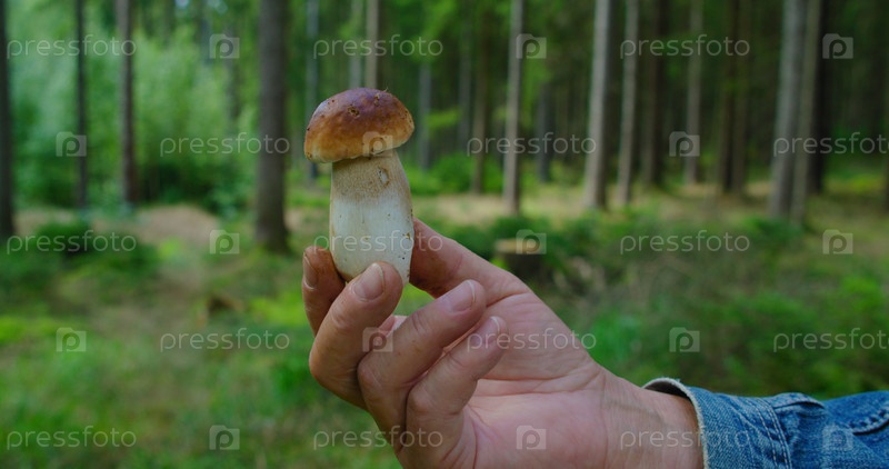 Мужская рука держит маленький свежий милый съедобный органический гриб подосиновик edulis в осеннем сосновом лесу. Экологически чистая продукция. Органическая веганская еда