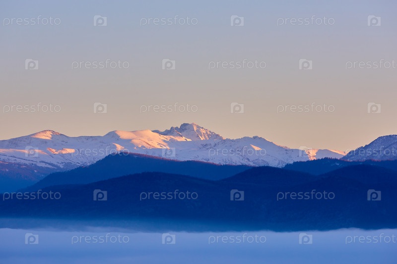 Снежные горы на закате и туманная долина на переднем плане
