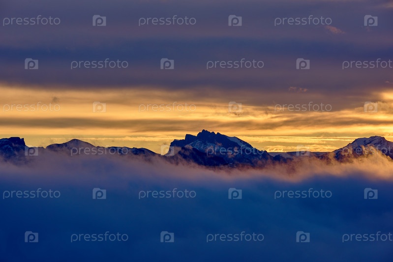 Скалистые горы между темным небом и туманом на восходе солнца
