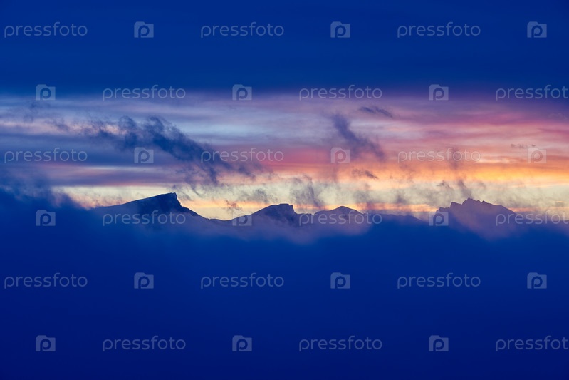 Скалистые горы между темным небом и туманом на восходе солнца