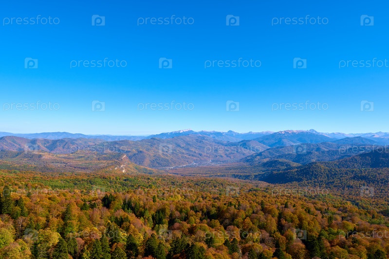 Горная долина с осенним лесом на закате. Голубое небо и луна