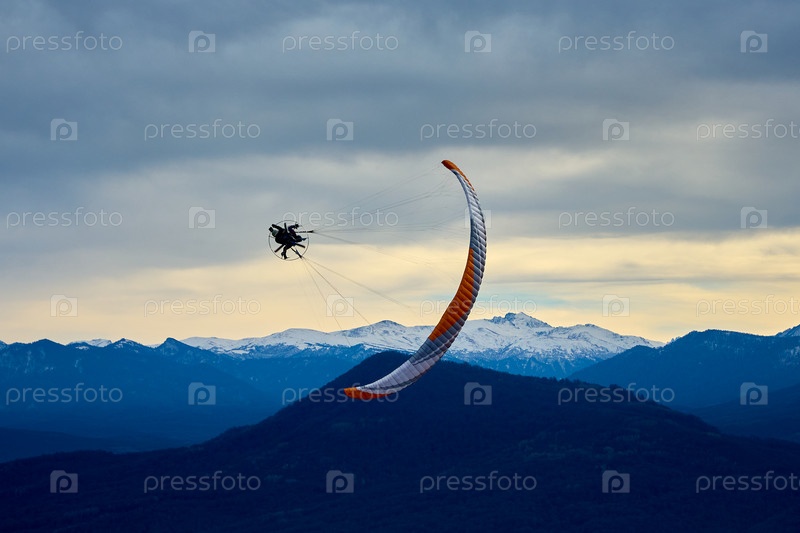 Экстремальный полет на мотопараплане на фоне грозового неба и заснеженных гор