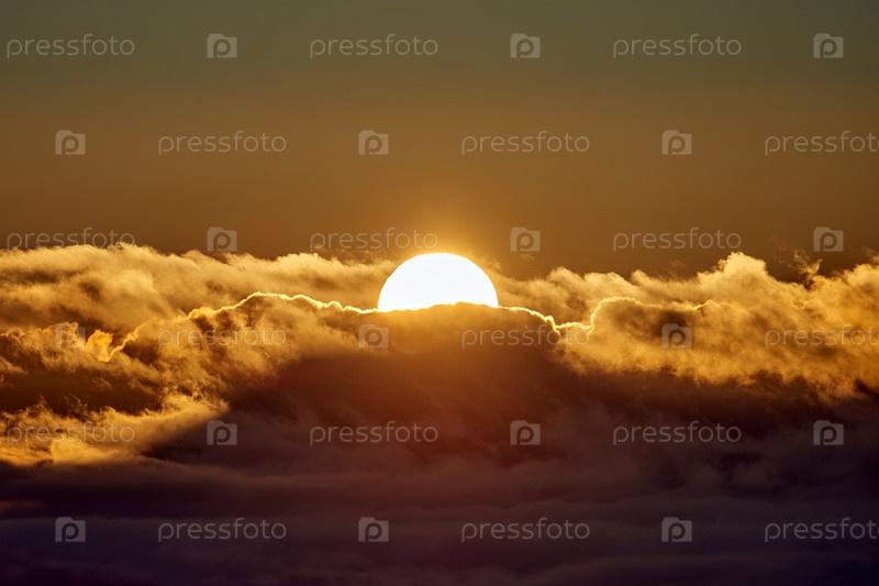 Солнце крупным планом на рассвете из-за гор, покрытых туманом