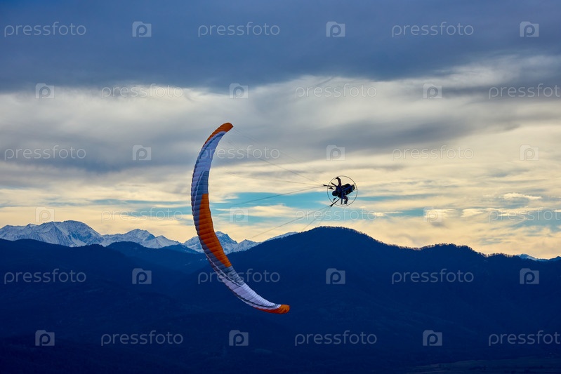 Экстремальный полет на мотопараплане на фоне грозового неба и заснеженных гор
