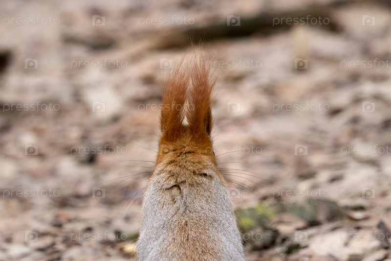 Белка на сухой листве. Вид сзади