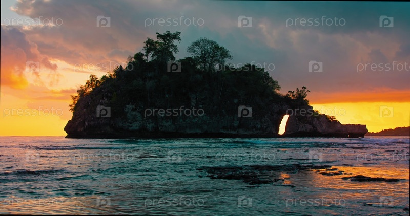 Спокойные океанские волны закат катятся по берегу пляжа Кристал Бэй, силуэт небольшого острова Нуса Пенида, Бали, Индонезия. Брызги морской соленой воды, камень, торчащий из воды с дырой внутри. Статический вид