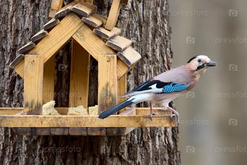 Джей сидит на кормушке для птиц