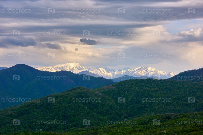 Заснеженные горные хребты на закате и грозовое небо