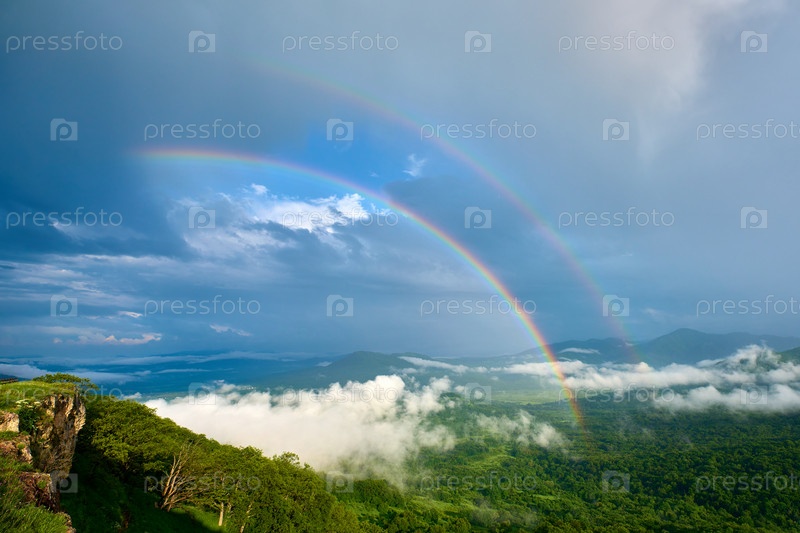 Двойная радуга на фоне кучевых облаков и гор