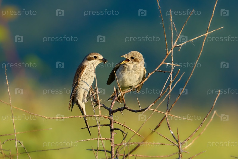 Красный сорокопут Lanius collurio. самка кормит цыплят