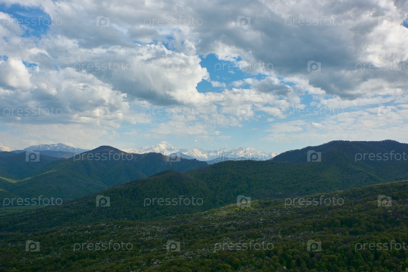 Горы, покрытые весенним зеленым лесом, и заснеженные горы на заднем плане. Облачное небо
