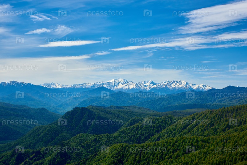 Заснеженные горные хребты и зеленый лес на переднем плане