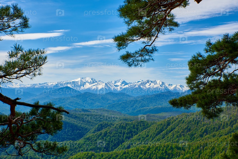 Заснеженный горный хребет виден сквозь сосновые ветки