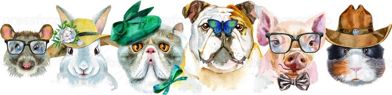 Граница из акварельных портретов собаки, морской свинки, кошки, мини-свиньи, кролика и крысы