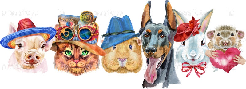 Граница с домашними животными. Ручная роспись акварелью, изолировать клип-арт на белом фоне. Дизайн баннера