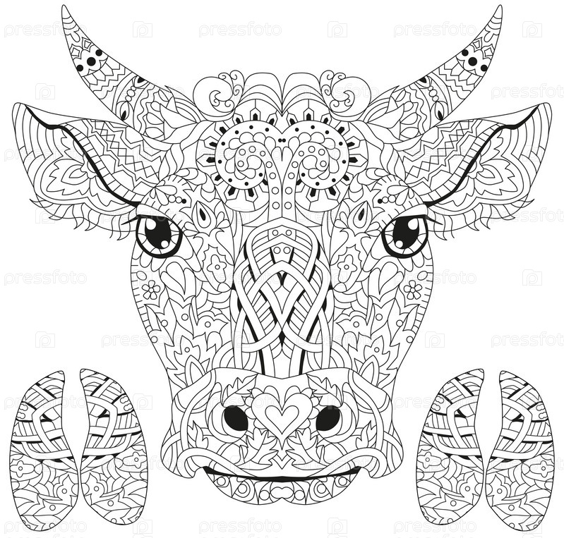 Текстильный принт быка с копытами для окрашивания. Энтангл, отличный дизайн для любых целей. Сила природы. Дизайн татуировки
