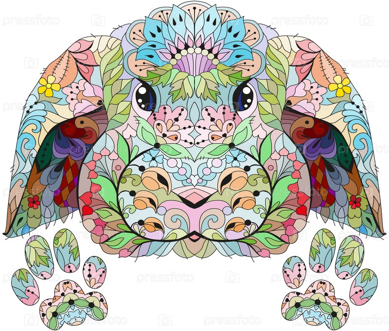 Запутайте голову кролика с лапками. Ручная рисованная декоративная векторная иллюстрация для раскраски
