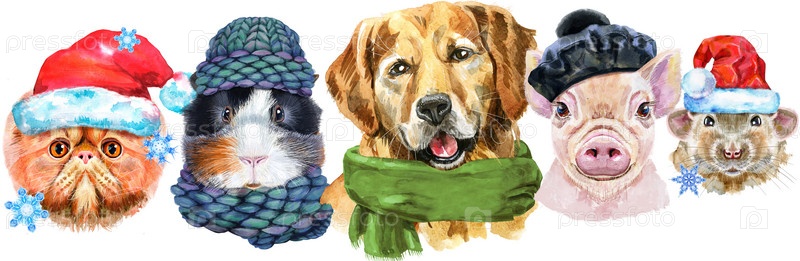 Граница с домашними животными. Ручная роспись акварелью, изолировать клип-арт на белом фоне. Дизайн баннера