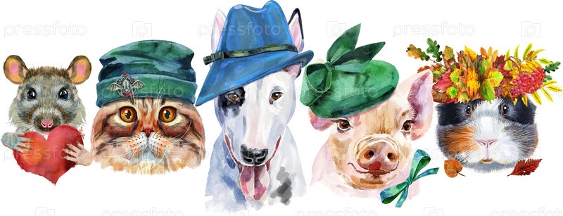 Граница с домашними животными. Ручная роспись акварелью, изолировать клип-арт на белом фоне. Дизайн баннера