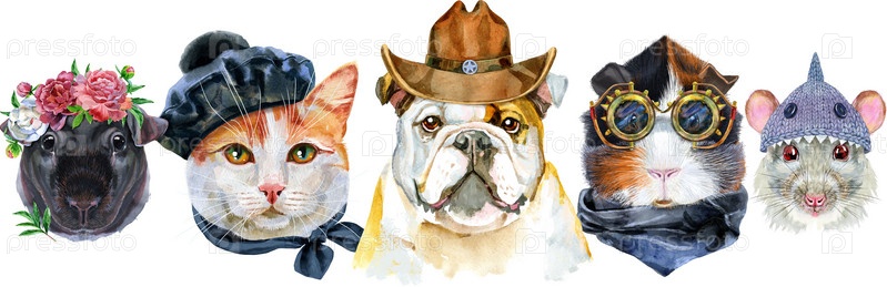 Граница с домашними животными. Ручная роспись акварелью, изолировать клип-арт на белом фоне. Дизайн баннера