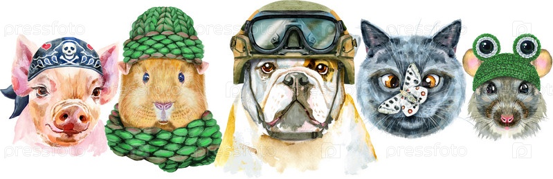 Граница из акварельных портретов собаки, морской свинки, кошки, мини-свиньи и крысы