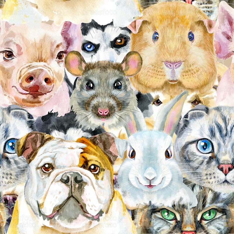 Бесшовный рисунок собаки, морской свинки, кошки, мини-свиньи, кролика и крысы. Акварель рисованной иллюстрации