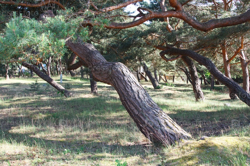Согнутые ветром сосны в лесу в летний солнечный день. Россия Калининград