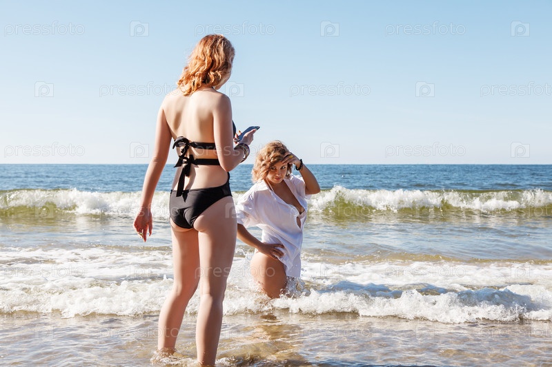 Две девушки в купальниках фотографируют друг друга на смартфон на берегу моря