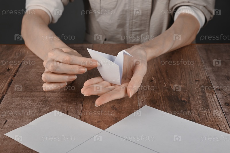 Руки пожилой женщины складывают бумагу для оригами. Создание журавлика из бумаги в технике оригами