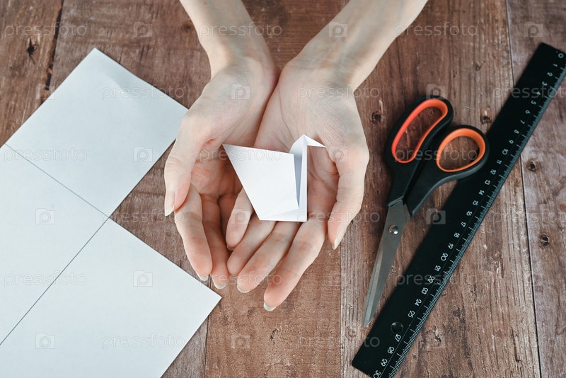 Руки пожилой женщины складывают бумагу для оригами. Создание журавлика из бумаги в технике оригами