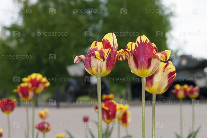 Желто-алые тюльпаны на фоне боевой техники времен Великой Отечественной войны возле диорамы "Курская дуга" (Россия, Белгород)