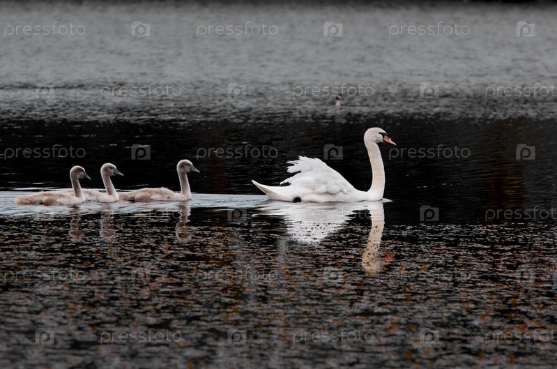 Лебедь и детеныши на озере.Лебеди птицы семейства Anatidae рода Cygnus.Близкими родственниками лебедей являются гуси и утки