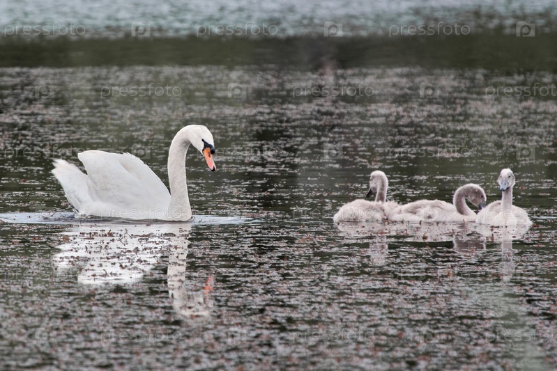 Лебедь и детеныши на озере.Лебеди птицы семейства Anatidae рода Cygnus.Близкими родственниками лебедей являются гуси и утки