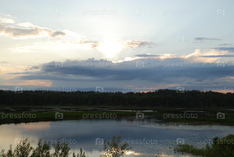 Закат в облаках над озером